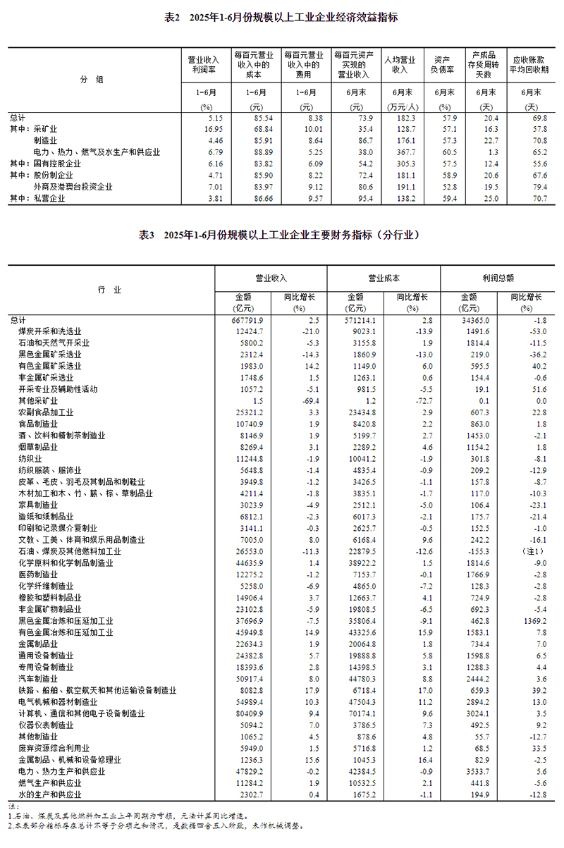 二、规模以上工业企业利润总额、营业收入等指标的增速均按可比口径计算。报告期数据与上年所公布的同指标数据之间有不可比因素,不能直接相比计算增速。其主要原因是:(一)根据统计制度,每年定期对规模以上工业企业调查范围进行调整。每年有部分企业达到规模标准纳入调查范围,也有部分企业因规模变小而退出调查范围,还有新建投产企业、破产、注(吊)销企业等变化。(二)加强统计执法,对统计执法检查中发现的不符合规模以上工业统计要求的企业进行了清理,对相关基数依规进行了修正。(三)加强数据质量管理,剔除跨地区、跨行业重复统计数据。