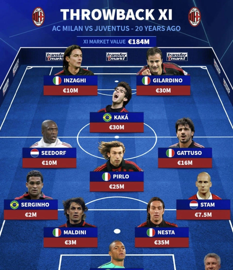AC米兰首发阵容总身价为1.84亿欧元,主教练为安切洛蒂;而尤文图斯首发阵容总身价为2.10亿欧元,主教练为卡佩罗。