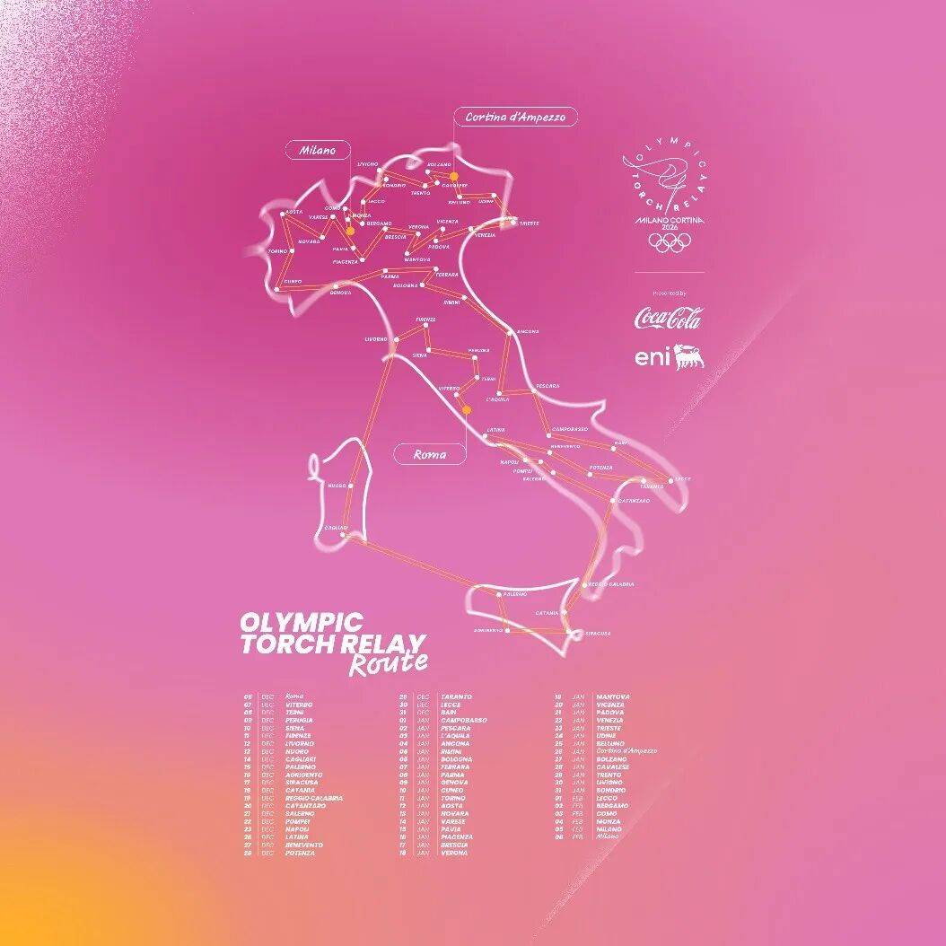 11月17日,2026年米兰-科尔蒂纳冬奥会公布奥运火炬传递完整路线日,奥运火炬将在意大利境内跨越1.2万公里,途经300多个市镇,到访60座城市,点亮多处世界遗产地,覆盖全国110个省。