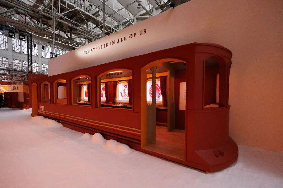 秀场本身更是精心设计的「冰雪竞技场」:门口的「雪场检票口」、站台指引牌、候车厅与小火车,构建出沉浸式体验场景,小火车内陈列的经典领奖服展区,既回溯了中国体育的荣耀历程,也暗合冬奥主题,实现了品牌记忆与体育盛事的深度绑定。