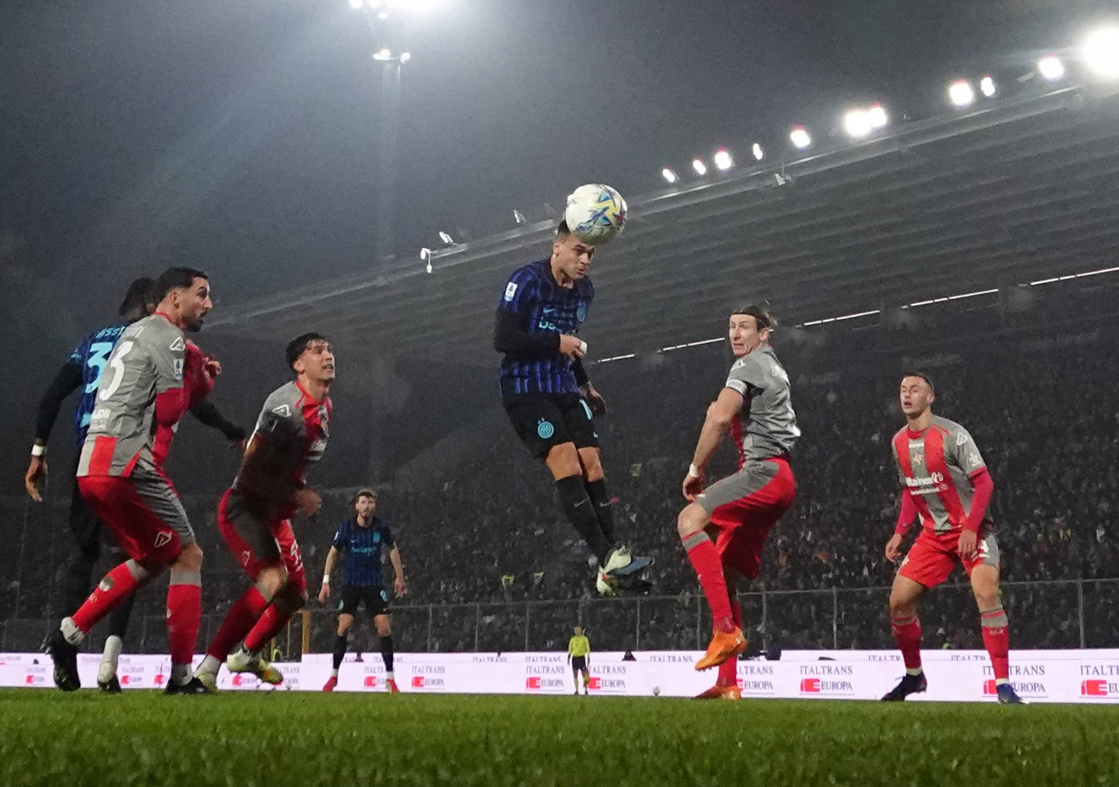 2月1日,国际米兰队球员劳塔罗·马丁内斯(左)与克雷莫内塞队球员格拉西在比赛中拼抢。 新华社发(阿尔贝托·林格利亚摄)