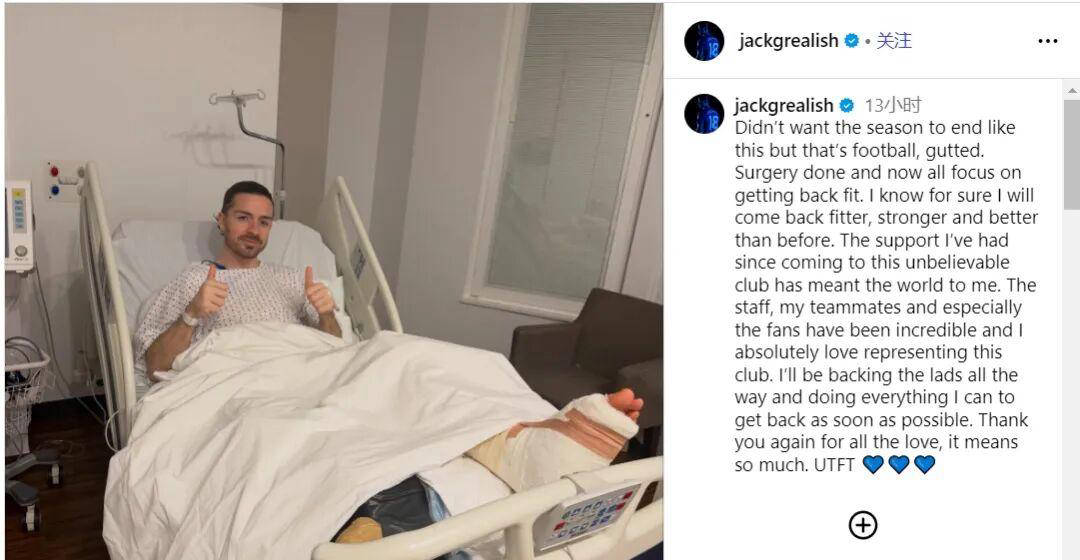 另外,曼城租借至埃弗顿的30岁球员格拉利什已通过社交媒体确认接受脚部应力性骨折手术,预计本赛季将无缘复出。