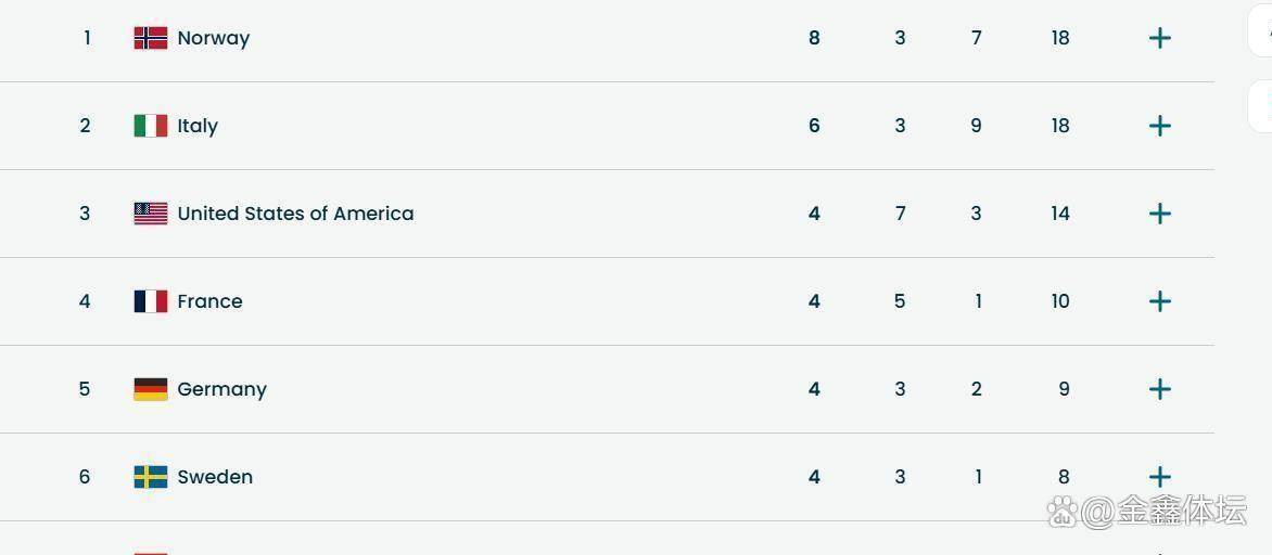 就在克莱博创造历史的同一天,2026年米兰-科尔蒂纳冬奥会的最新金牌榜也正式出炉。 挪威代表团以8枚金牌、18枚奖牌的绝对优势,继续稳坐头把交椅。东道主意大利队凭借主场之利,以6枚金牌、9枚铜牌紧随其后,奖牌总数与挪威持平,竞争异常激烈。美国、法国、德国等传统强队则在金牌数上并驾齐驱,形成了争夺第二集团的混战局面。