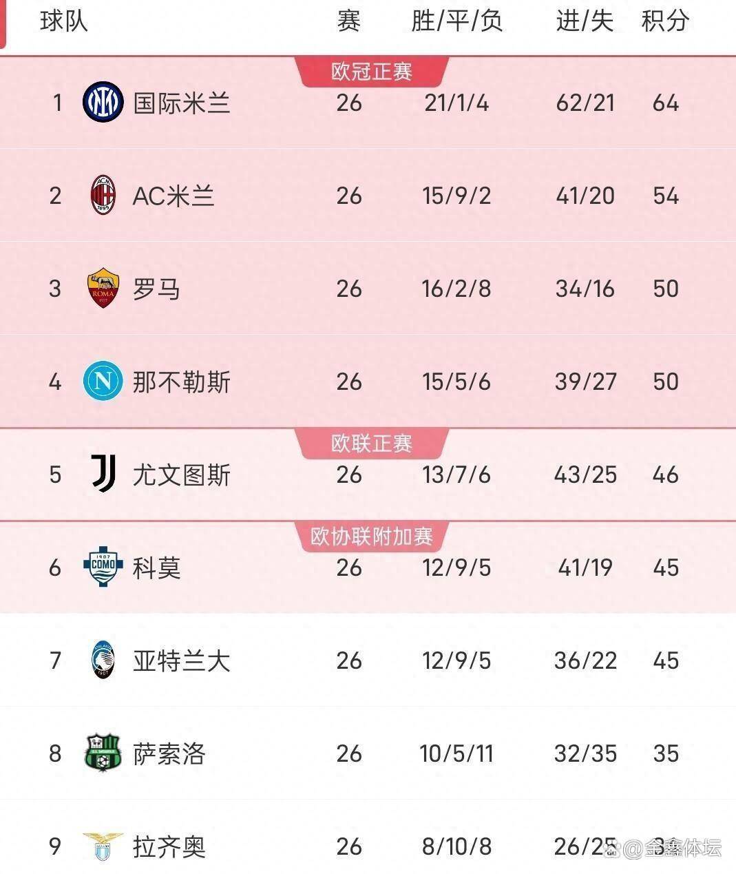 罗马队则没有浪费机会,他们在主场3比0干净利落地击败了克雷莫纳,全取三分。 这一连串出人意料的结果,像一块巨石投入湖中,瞬间搅动了整个意甲积分榜的格局。 国际米兰在客场2比0战胜莱切后,已经将领先优势扩大到了令人绝望的10分。 而原本胶着的欧冠资格区,因为罗马的胜利和那不勒斯的失利,排名发生了直接对调,从第三名到第七名,五支球队之间的分差最大只有5分,一场空前惨烈的“争四大乱斗”正式拉开了序幕。
