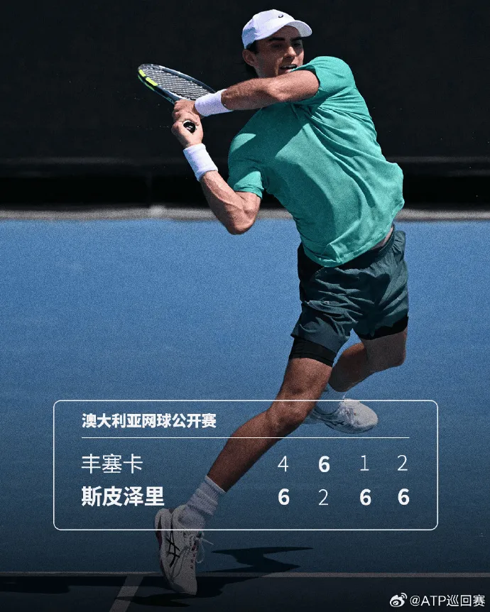 虎扑01月20日讯 澳网男单首轮,世界排名第85的美国球员斯皮泽里3-1淘汰28号种子丰塞卡淘汰出局,取得了澳网正赛首胜、大满贯正赛第二胜(2025美网)。